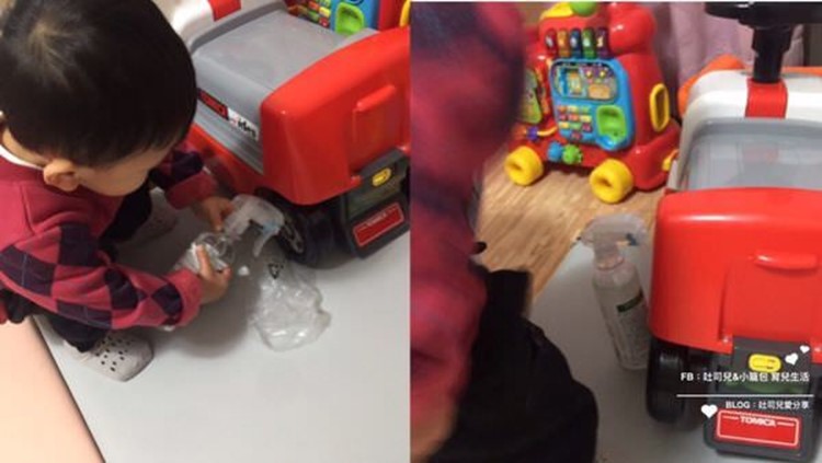 ▲我拿NTS天然抗菌除臭達人在幫他消毒玩具,小籠包說他在修理車子XDDD!